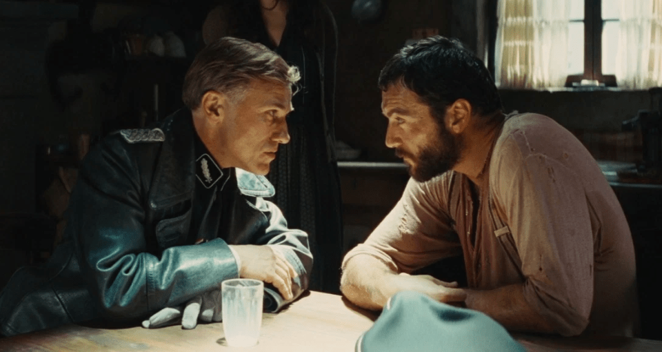 The conversation continues to grow in suspense until it almost appears to be over, that is until Landa drops his polite demeanor and doesn’t even ask LaPadite if he is sheltering the family they are looking for, he tells him. LaPadite admits this, selling out those who put trust in him. You can see he is visibly upset. The tension in the room then escalates from if Landa will find the family to what will happen to them next. A question answered rather quickly. Landa states to LaPadite that they will be going now, has his men line up their guns with the floor boards, and executes all but one who managed to get away. This is the most important part of tension: the pay off. If there were to be some magical thing swooping down to save the family last minute, then all tension regarding Landa as a threat are whipped out for the rest of the film. This is not what occurs, instead what we are left with is a very dedicated and detail oriented man on a warpath to hunt down his targets.